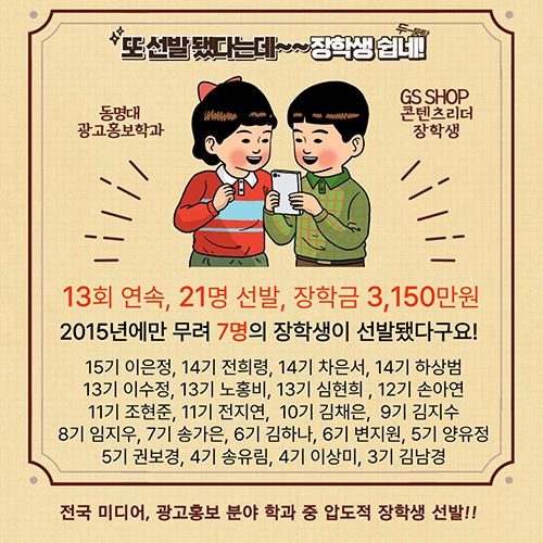 2학년 손아연 학생의 외부 장학금 소식✨️ 요즘 활발한 활약이 돋보이는 손아연 학생이 전국 미디어커뮤니케이션학과 광고홍보학과 학생 중에서 14명만 선발한 에 선발됐어요. 축하합니다. 다음은 여러분의 차례!! . . #광고홍보학과 #콘텐츠리더