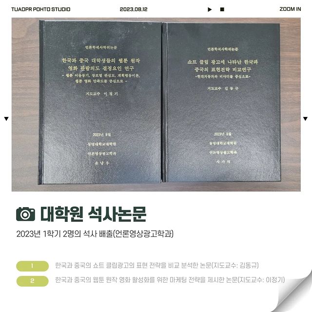 📣 동명대 광고홍보학과 대학원(언론영상광고학과)은 2023년 1학기에 2명의 석사를 배출했어요.🎉 김동규 교수님은 쇼트클립 광고에 나타난 한국과 중국