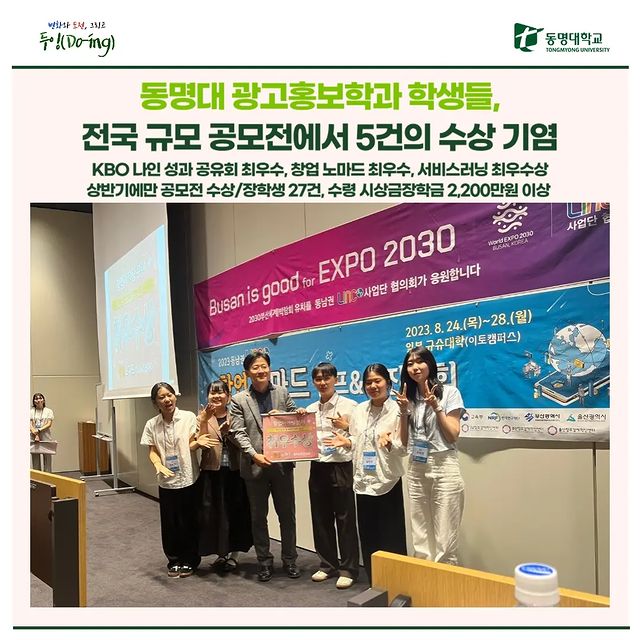 📣 동명대 광고홍보학과 소식; 2023년 상반기 에 광고홍보학과는 27건의 수상, 시상금(장학금) 2200만원을 기록 중입니다. 👍 하반기에는 몇 건의 수상, 장