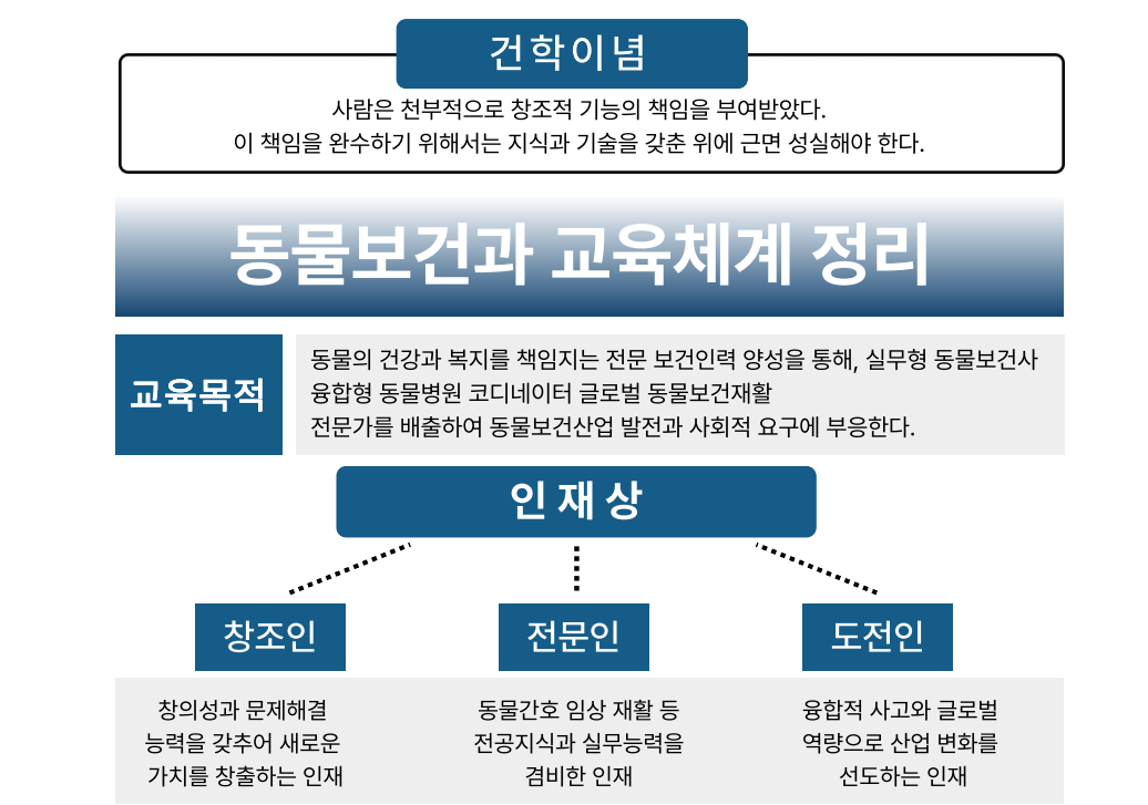 생명존중의 가치를 최우선으로 한 반려동물 간호 및 진료보조서비스와 건강을 담당하는 동물보건인 양성