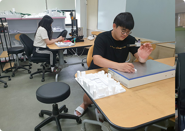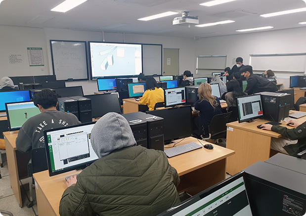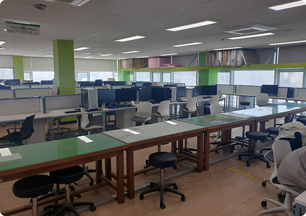 학년별 통합 건축 STUDIO 실습실과 레이저 커터 등 모형제작기구를 갖춘 조형 실습실이 있으며, 실사 출력 가능한 플로터를 구비하고 있습니다. 평면과 3D 작업을 할 수 있는 컴퓨터 실습실이 있으며, BIM 사업단 참여로 REVIT, ArchiCAD 등 대부분의 BIM 소프트웨어를 보유하여 수업에 활용하고 있습니다.