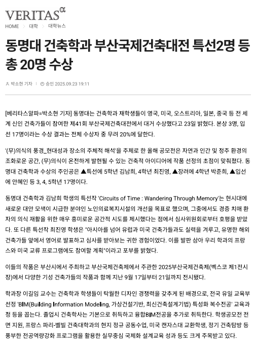 동명대 건축학과 부산국제건축대전 특선2명 등 총 20명 수상