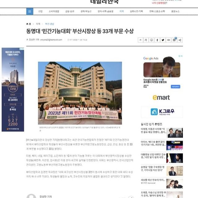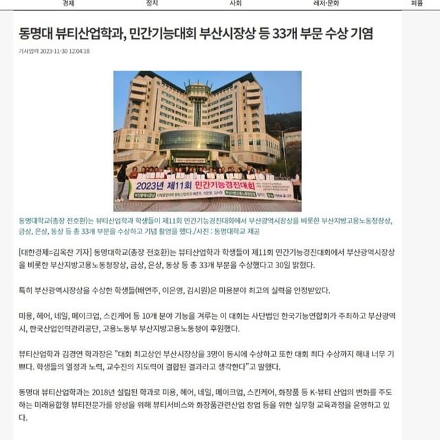 동명대 ‘민간기능대회’ 부산시장상 등 33개 부문 수상(데일리 한국)