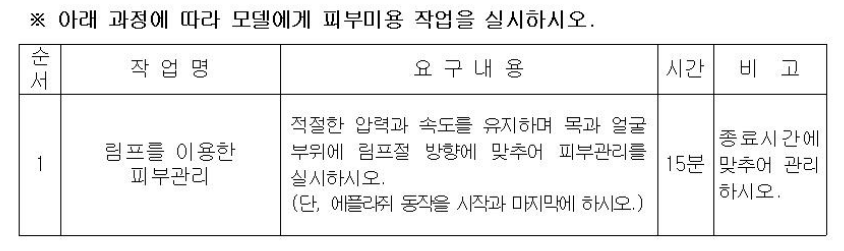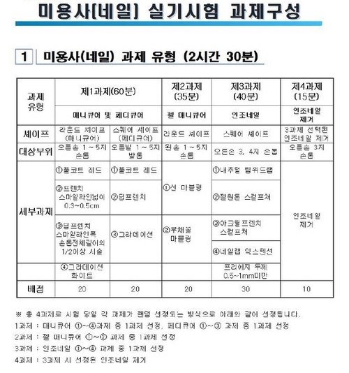 1. 과제는 모델의 오른손, 오른발에 습식매니큐어, 페디큐어 각각 30분씩 총 60분동안 과제에 맞는 작업을 수행하면 됩니다. 습식매니큐어(손관리)와 페디큐어(발관리)는 네일아트에서는 기초 작업 및 기술이라 볼 수 있으며 크게 소독, 네일 쉐입 변형, 큐티클을 불려 제거하는 기술, 컬러링에 해당됩니다. 컬러링은 풀코트, 프렌치, 딥프렌치, 그라데이션 중 하나가 출제됩니다. 네일의 모든 시험은 여러 개 중 하나가 출제되기 때문에 제시된 과제는 다 연습하셔야 하며, 1과제니 만큼 위생과 제품 세팅에 신경을 쓰셔야 합니다. 사소한 부분들을 놓치시면 많은 감점이 발생될 수 있습니다. 간과하지 마시고 필요한 제품들을 깔끔하게 정리하셔서 준비해주세요.