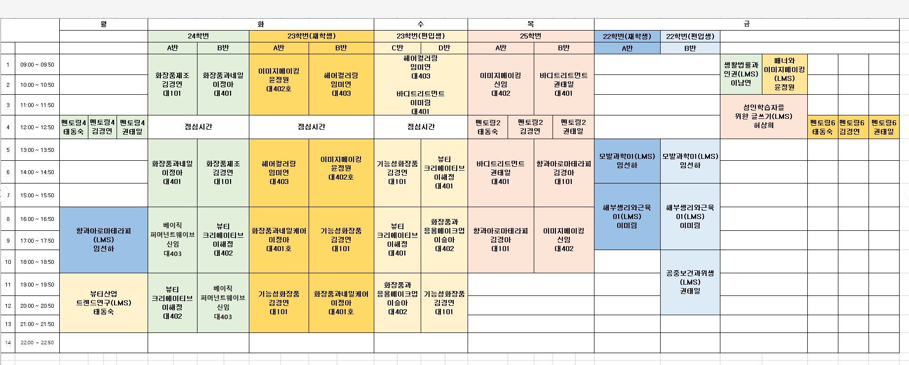 2025학년도 2학기 뷰티산업학과 시간표 안내