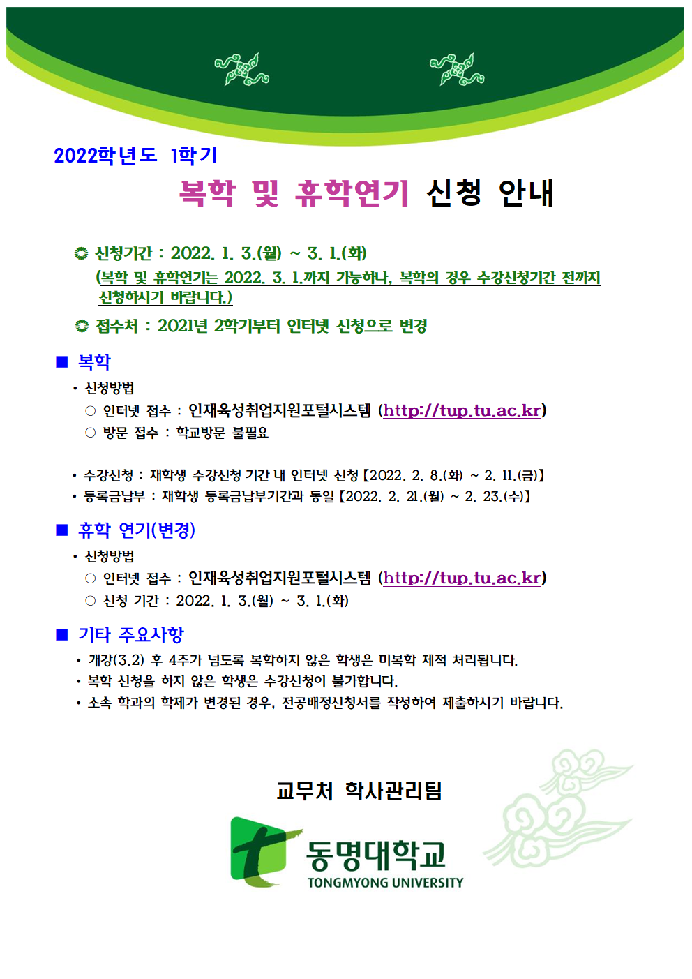 2022학년도 1학기 복학 및 휴학연기 신청 안내