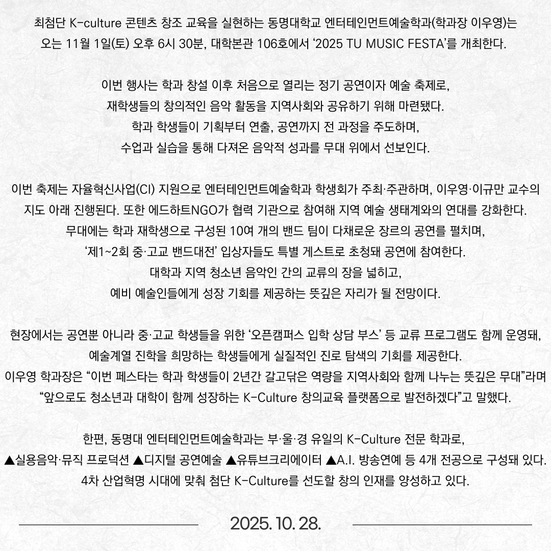 동명대 엔터테인먼트예술학과, 세계를 잇는 K-POP 창의 예술 페스티벌 ‘2025 TU MUSIC FESTA’ 성료