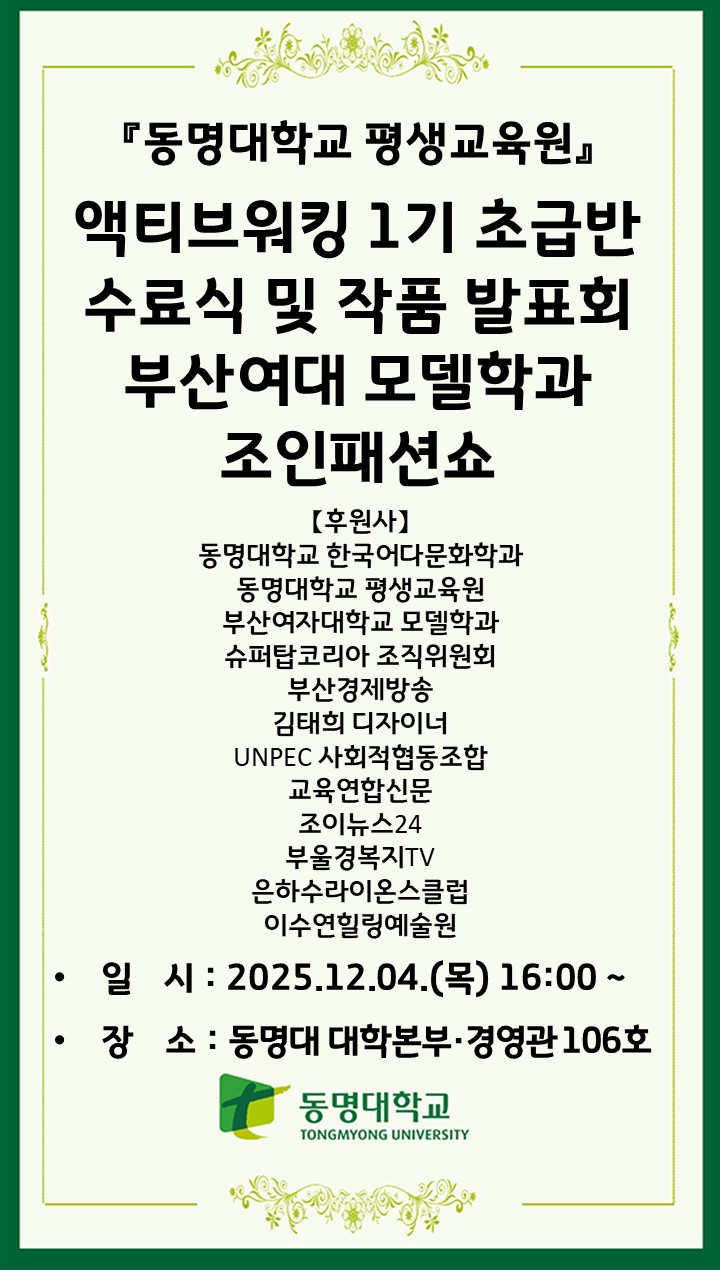 오는 2025년 12월 4일 목요일 오후 4시, 동명대학교 대학본부 경영관 106호에서 액티브워킹 발표회가 개최될 예정입니다.