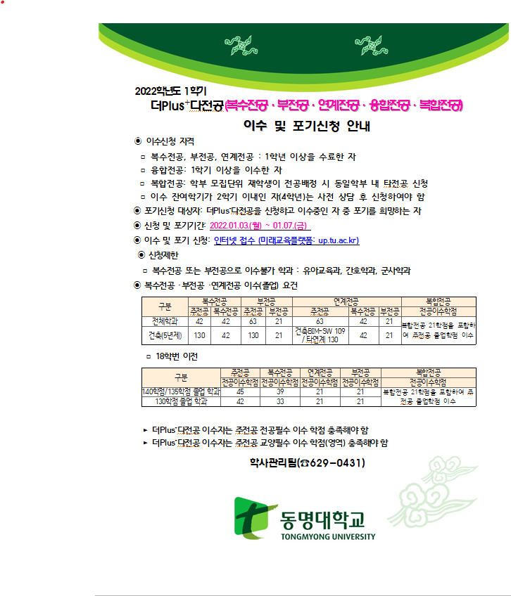 2022학년도 1학기 더 PLUS+ 다전공 이수 및 포기신청 안내