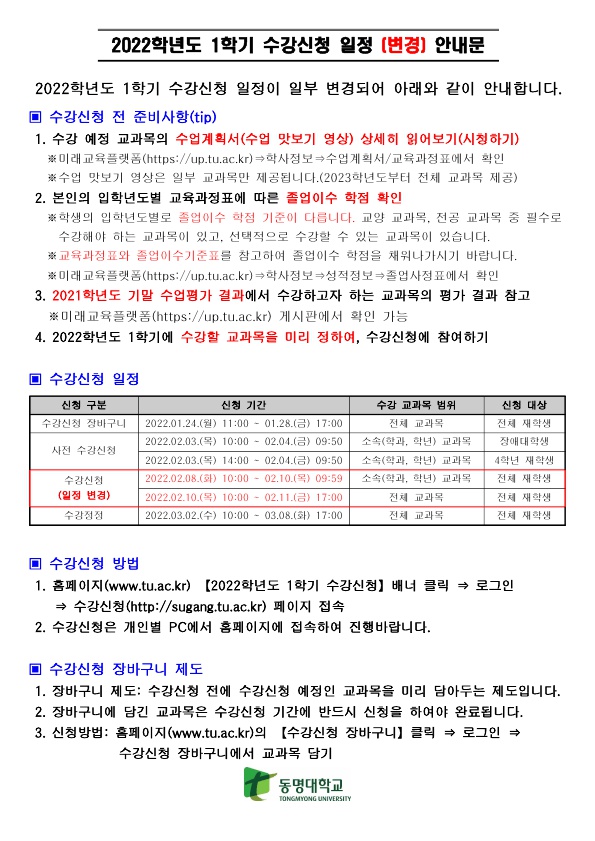 2022학년 1학기 수강신청 일정 일부 변경 안내