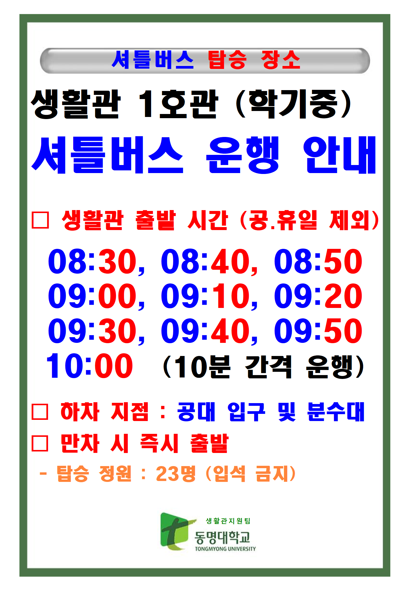 2025학년도 2학기 동명생활관 1호관 셔틀버스를 아래와 같이 운행하오니 많은 이용바랍니다.