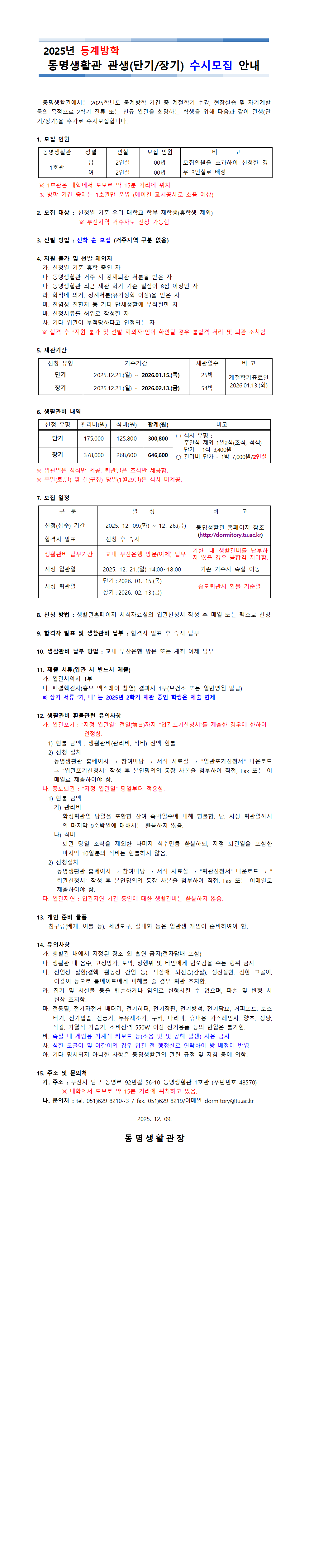 2025년 동계방학 생활관 잔류 및 신규 입관생 추가 모집 안내_개별신청