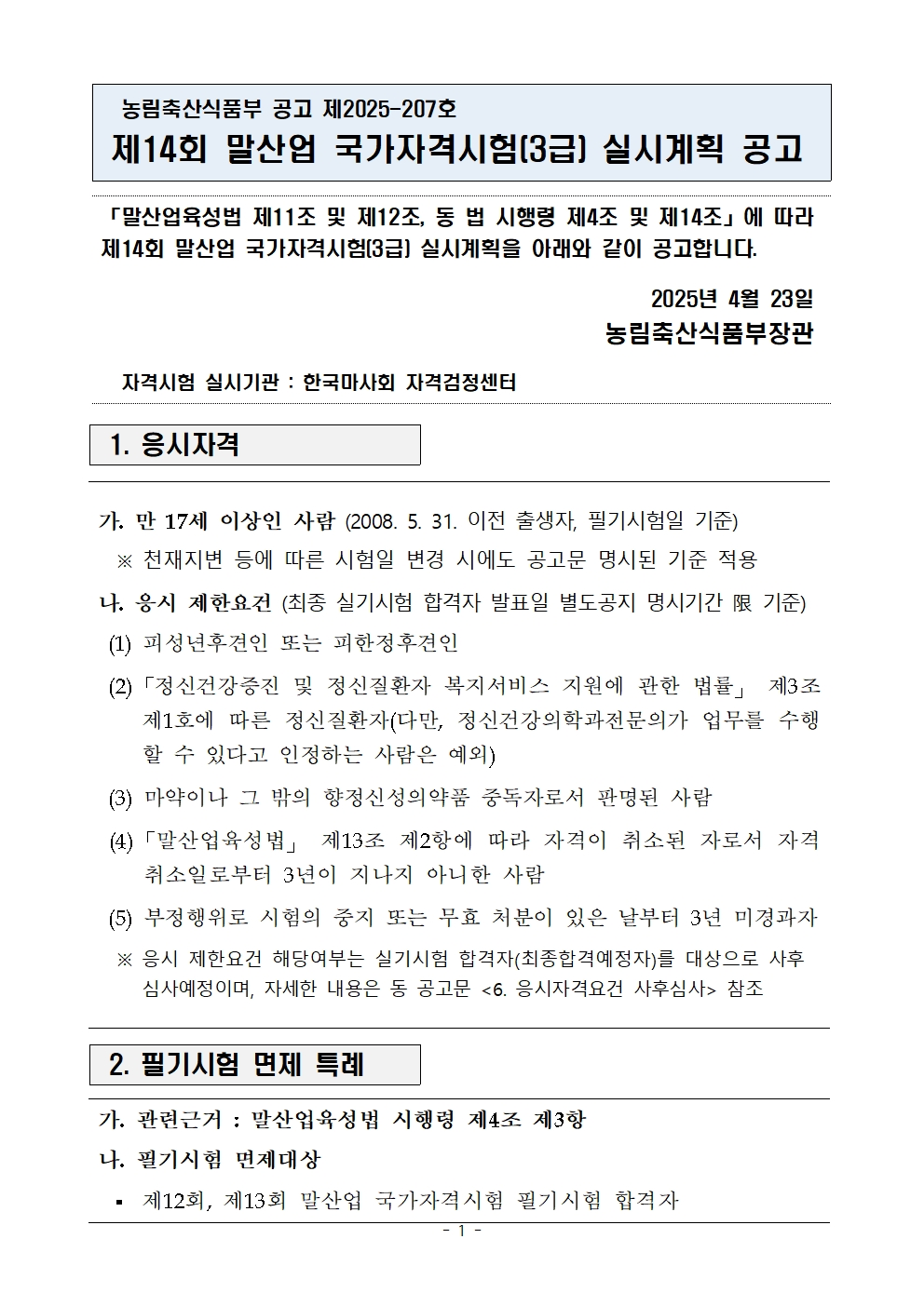 말 산업 국자자격시험(3급) 실시계획 공고