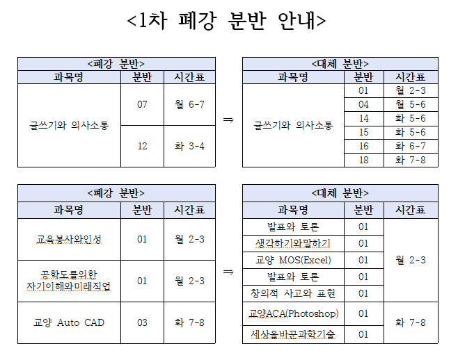해당 분반에 수강 신청한 학생들은 아래 내용을 확인하시고 대체 분반으로 이동해 주시기 바랍니다.