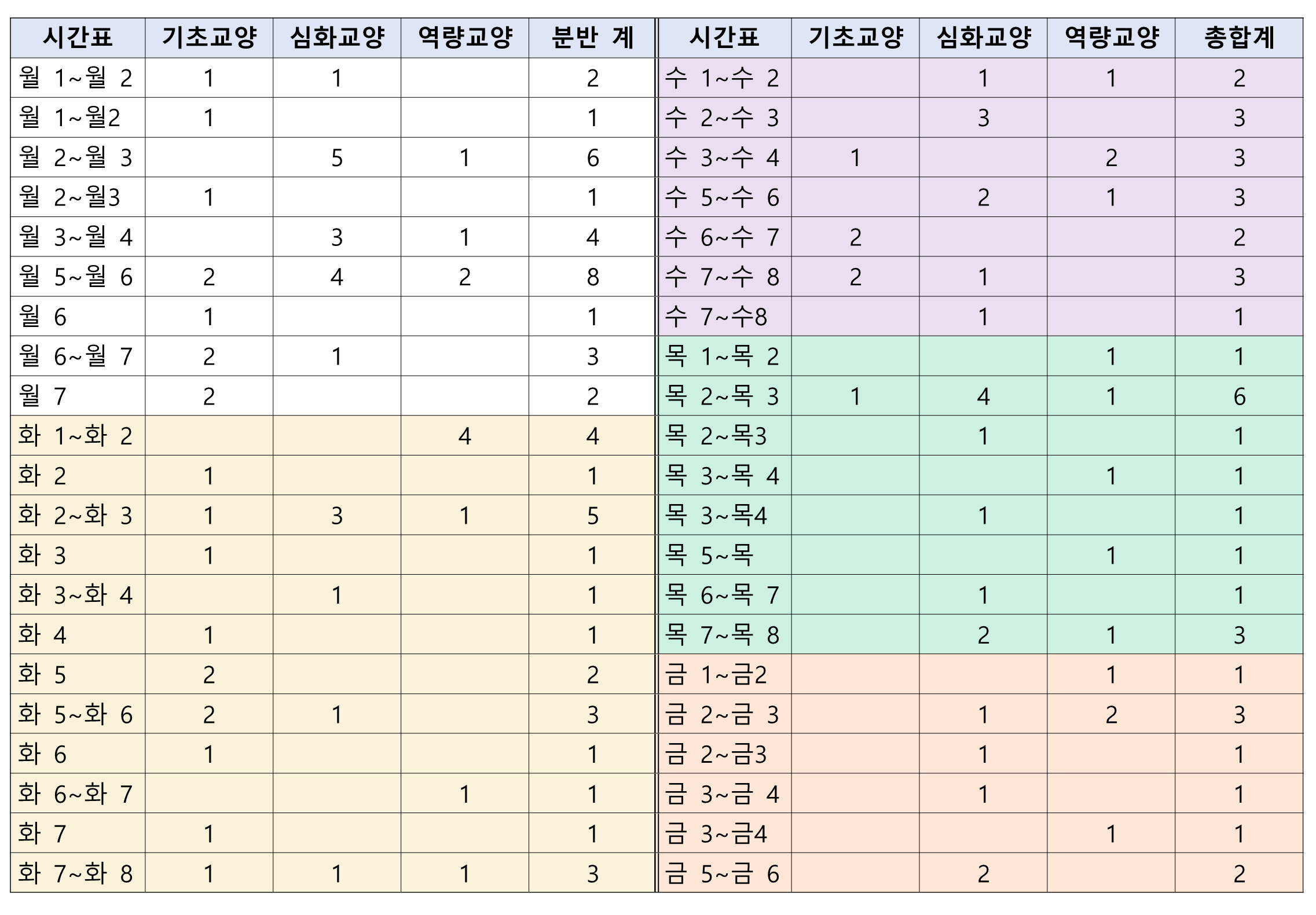 요일별 과목 확인은 첨부된 엑셀 파일을 확인하세요.