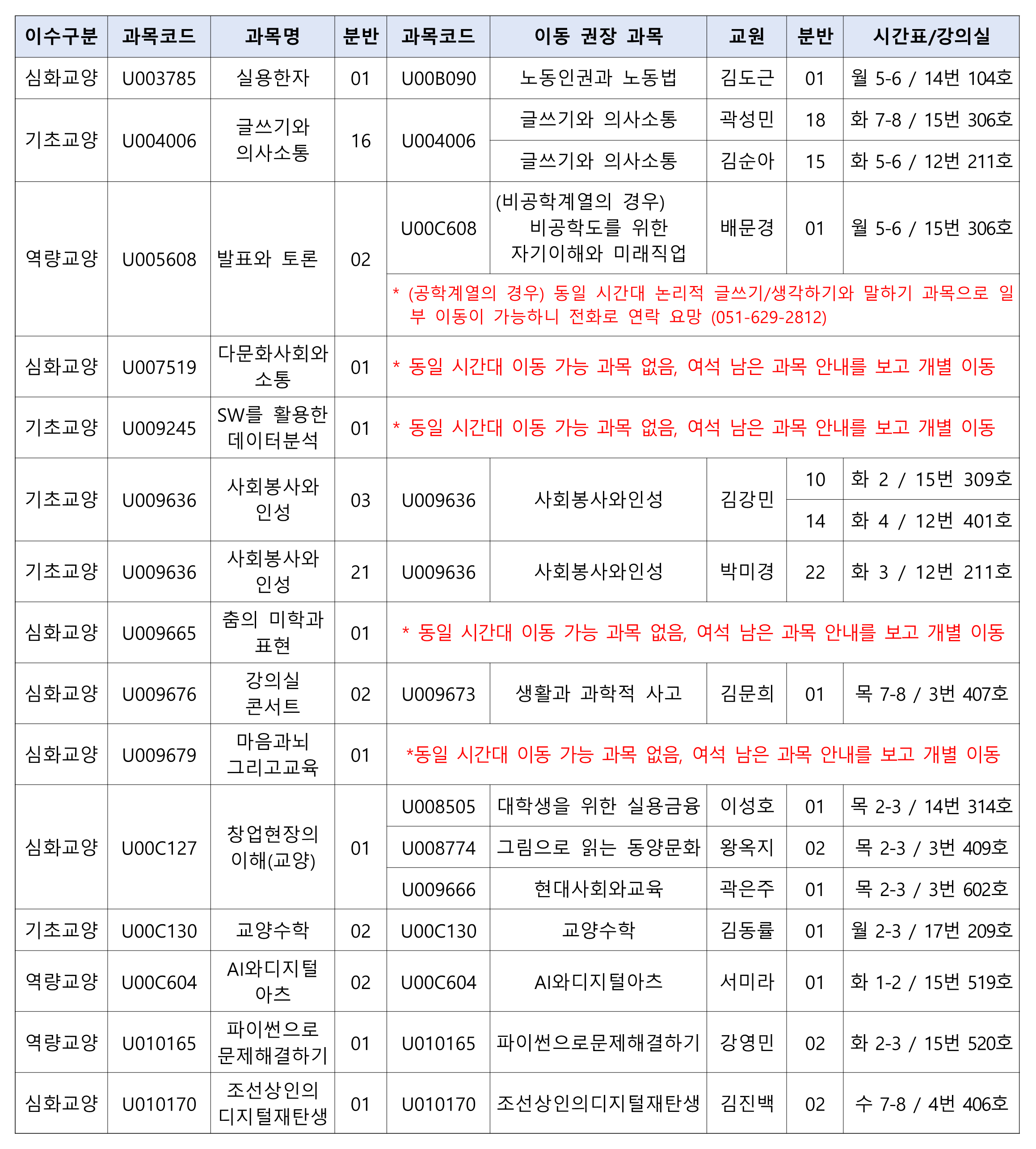 권장 과목으로 이동을 원하지 않는 학생 혹은 권장 과목이 없는 학생들은 ‘여석이 남은 과목 안내’를 보고 본인 시간표에 맞추어 이동 바랍니다.