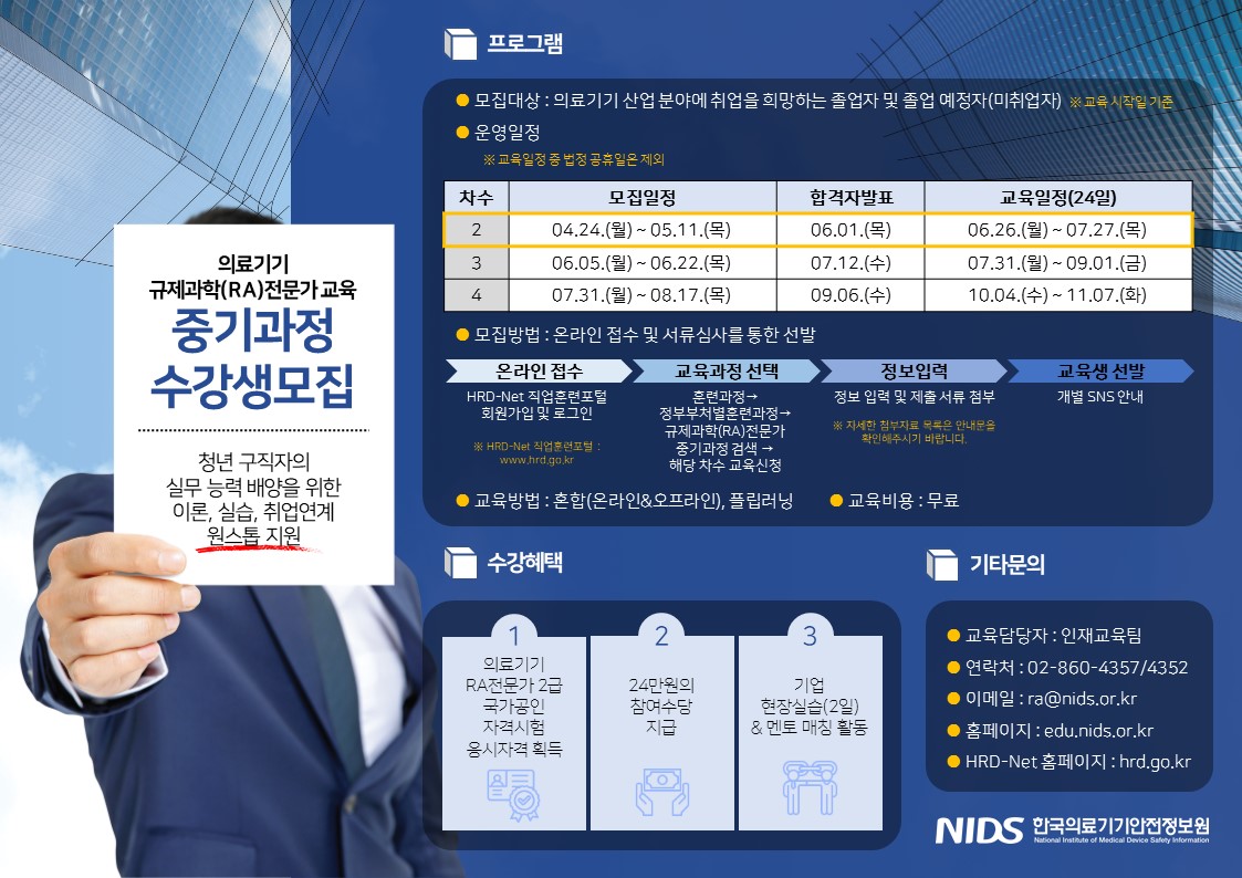 고용노동부 일자리 지원 사업 「의료기기 규제과학(RA)전문가 교육 중기과정(2차)」 교육생 모집 안내