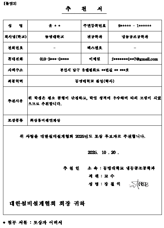 동명대학교 냉동공조공학과 4학년 유** 군이 2025년 (사) 대한설비설계협회 협회의 최상홍 미래인재상 대상자로 선정되었습니다.