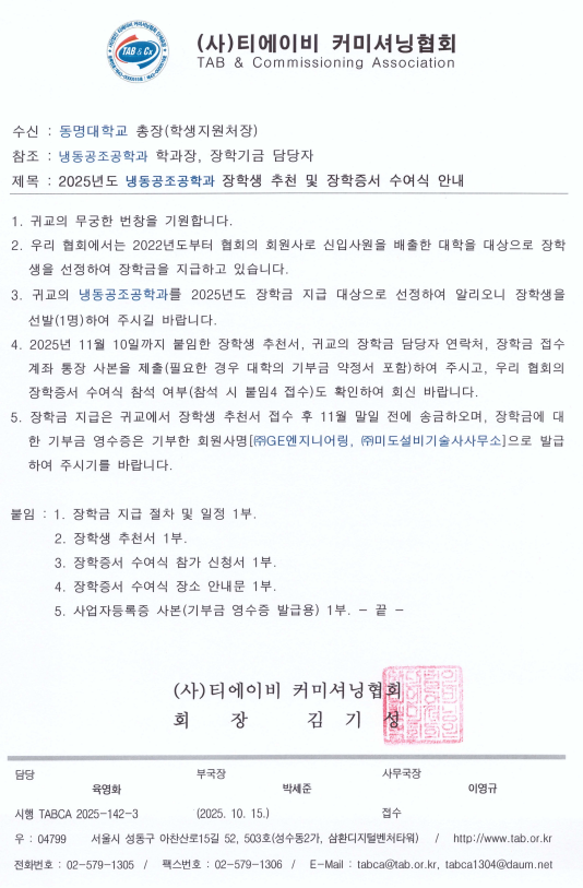 동명대학교 냉동공조공학과 4학년 이** 군이 2025년 (사) 티에비 커미셔닝 협회의 장학생으로 선정되었습니다.