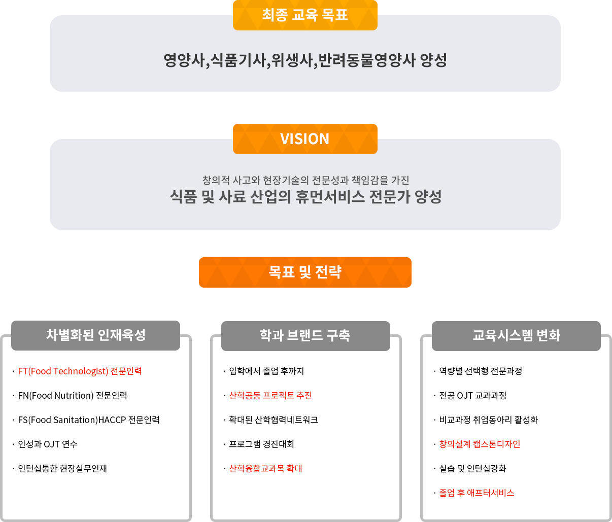 경쟁력 있는 식품의 제조, 공정운영, 품질관리 등을 담당하는 기능성식품 전문가, 식품 생산 과정 중 혼입될 수 있는 위해 요소를 제어하여 안전한 식품을 제조할 수 있는 위해 요소중점관리(HACCP) 전문가, 질병예방과 건강증진을 위해 급식관리 및 영양서비스를 수행하는 영양사 및 식생활 건강 케어 전문가를 양성한다.