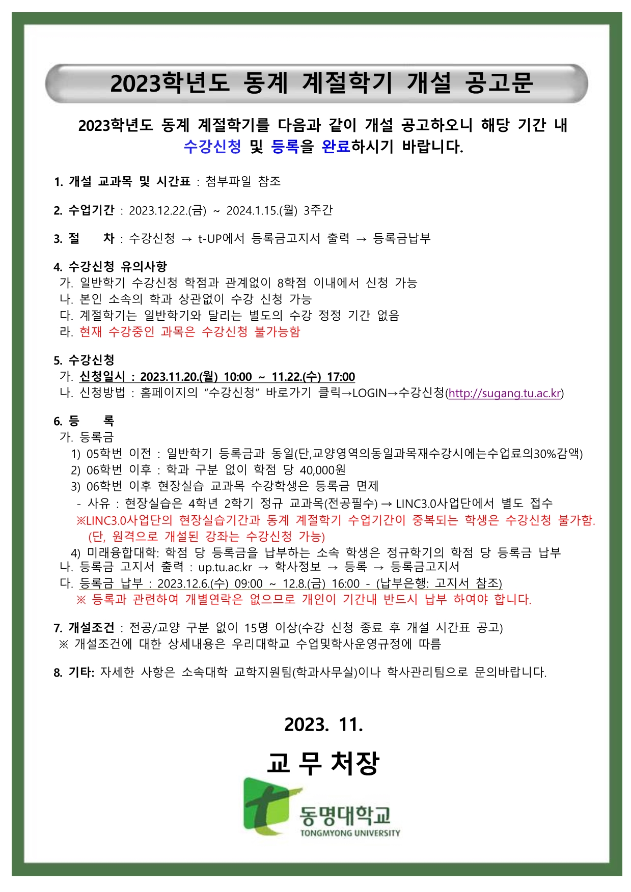 2023학년도 동계 계절학기 수요조사 실시 안내