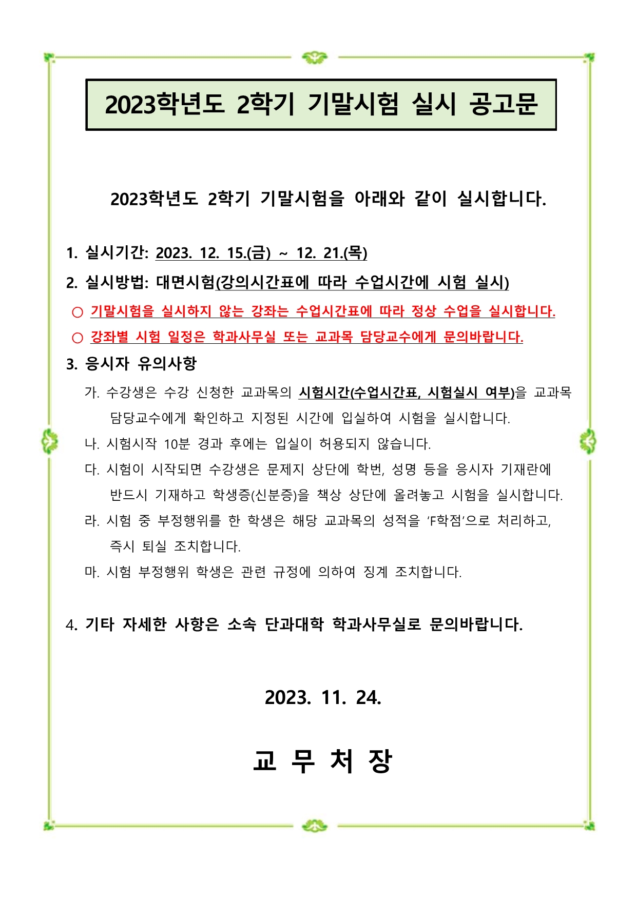 2023학년도 2학기 기말시험 일정 안내
