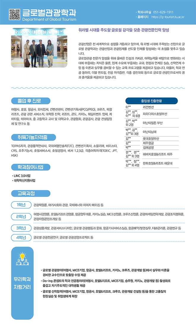 - 글로벌 산학협력(여행사, MICE기업, 항공사, 호텔&리조트, 크루즈, 관광개발 컨설팅 등)을 통한 고품질의 현장실습 및 취업생태계 확장