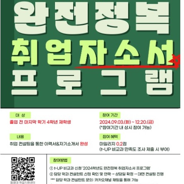 4학년 재학생들의 취업 준비의 첫 관문인 자기소개서를 졸업전 100% 완성을 목표로 "2024학년도 취업자소서 완전정복" 프로그램을 소개합니다!