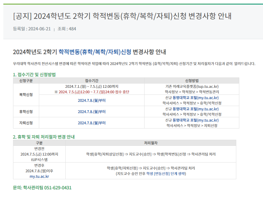 [공지] 2024학년도 2학기 학적변동(휴학/복학/자퇴)신청 변경사항 안내