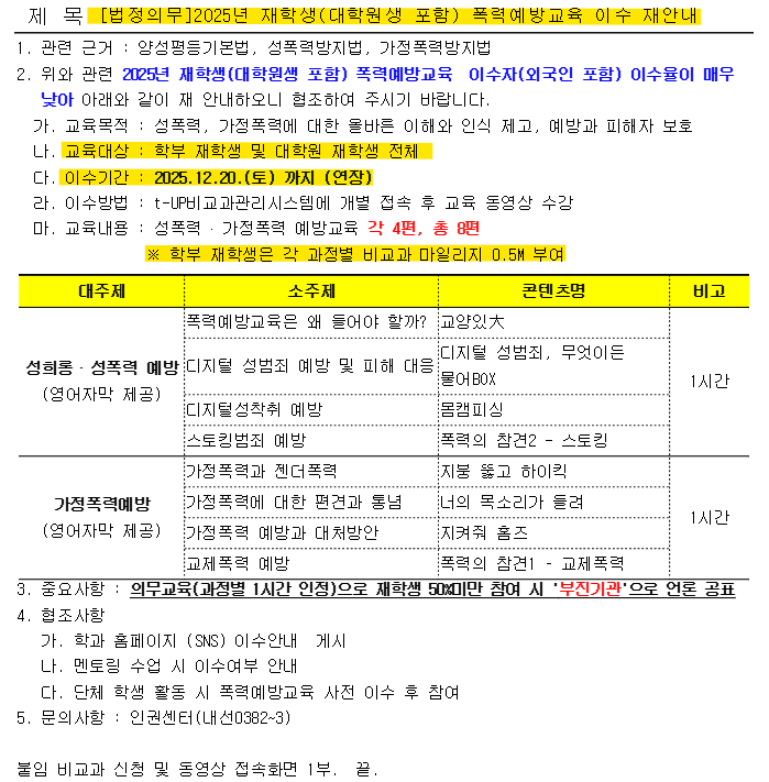 [법정의무]2025년 재학생(대학원생 포함) 폭력예방교육 이수 재안내