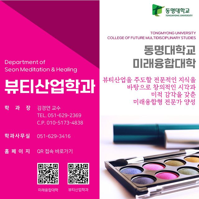 • BLOG [동명대학교 학과 소개] 뷰티산업학과를 소개합니다! 안녕하세요! 동명대학교입니다. 오늘 소개해 드릴 학과는 뷰티산업을 주도할 전문적인 지식을 바탕으로 창의적인 시각과 미적 감각을 갖춘 미래융합형 전문가를 양성하는 뷰티산업학과입니다. 뷰티산업학과의 교육목표는? 우리 대학의 중장기 발전 계획 [TU VISION 2025] 를 수립하여 미래를 선도하는 [No.1 산학협력 교육 허브] 비전의 달성을 위한 시대적 흐름을 반영하여 미래를 선도하는 평생교육 체제를 구축하였습니다. 성인학습자의 역량 강화와 뷰티산업의 시대적 흐름과 환경적 변화를 반영하여 뷰티 산업을 주도할 과학적 지식과 향장의 기능적 요소를 바탕으로 뷰티산업 전문가 및 지식 집약적 화장품 산업을 융합할 수 있는 미래융합.......