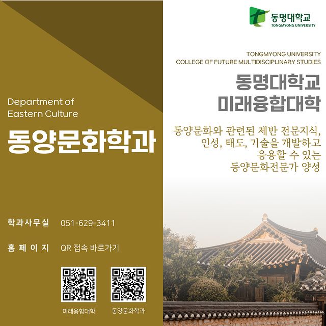 • INSTAGRAM 🎎동명대학교 동양문화학과를 소개합니다!🎎 🎎동명대학교 동양문화학과를 소개합니다!🎎 동양문화와 관련된 제반 전문지식, 인성, 태도, 기술을 개발하고 응용할 수 있는 동양문화전문가 양성 🌟작금의 4차 산업혁명 시대 더욱 주목되는 인성 및 태도, 지식 등을 배양하고 졸업 후 취업ㆍ창업 영역에서 즉시 적용 가능한 실무역량을 준비할 수 있을 것으로 기대합니다. - 윤리적 상담 전문가 - 전문적 상담 전문가 - 실천적 계획 전문가 - 수여학위 문학사 📍성인학습자를 위한 다양한 지원제도 - 매학기 9학점 장학금 지급 - 학점당등록금제/등록금 분할납부제/입학 전 직무 경험 최대 10학점 인정/입학 후 3년 내 졸업가능(조기졸업)/ 졸업학점 110학점 - 학습역량진단T-Plus/K-CESA - 학습단계별 지원 프로그램 - 비학위과정 [재학생&지역민] - 취업창업역량강화 - 서비스러닝(교과-비교과) - 더블멘토링(교수-학생-산업체) - TU멘토링 - 성인학습지원센터 심리상담(집단상담/개인상담) & 학습상담 & 진로상담(객원상담원) 📍성인학습자 친화형 수업방식 - 일과 학습 병행이 가능한 주 1~2회 수업 - 이론식수업보다자격증과현장형수업을통하여학위취득직후취·창업가능 - 현장중심 성인학습자형 Co-Op프로그램 - 직무맞춤형 마이크로디그리 교육과정 - 지역사회 연계형 서비스러닝, 리빙랩 프로그램 - 성인친화적 온라인, 하이브리드방식 적극 활용 수업 ☎ 동명대학교 입학처 : 051) 629-1111 ☎ 동양문화학과 : 051) 629-3411 🗨 카톡 플러스친구 : 동명대학교 #대학입학정보 #동명대학교 #동명대 #대학입시 #대학 #대학교 #입시 #학과추천 #고3 #학교추천 #유망학과 #동양 #동양문화 #성인학습자 #풍수지리상담사 #명리상담사 #경관플래너 #풍수지리 #풍수전문컨설팅 #풍수인테리어 #감정평가사 #주택관리사