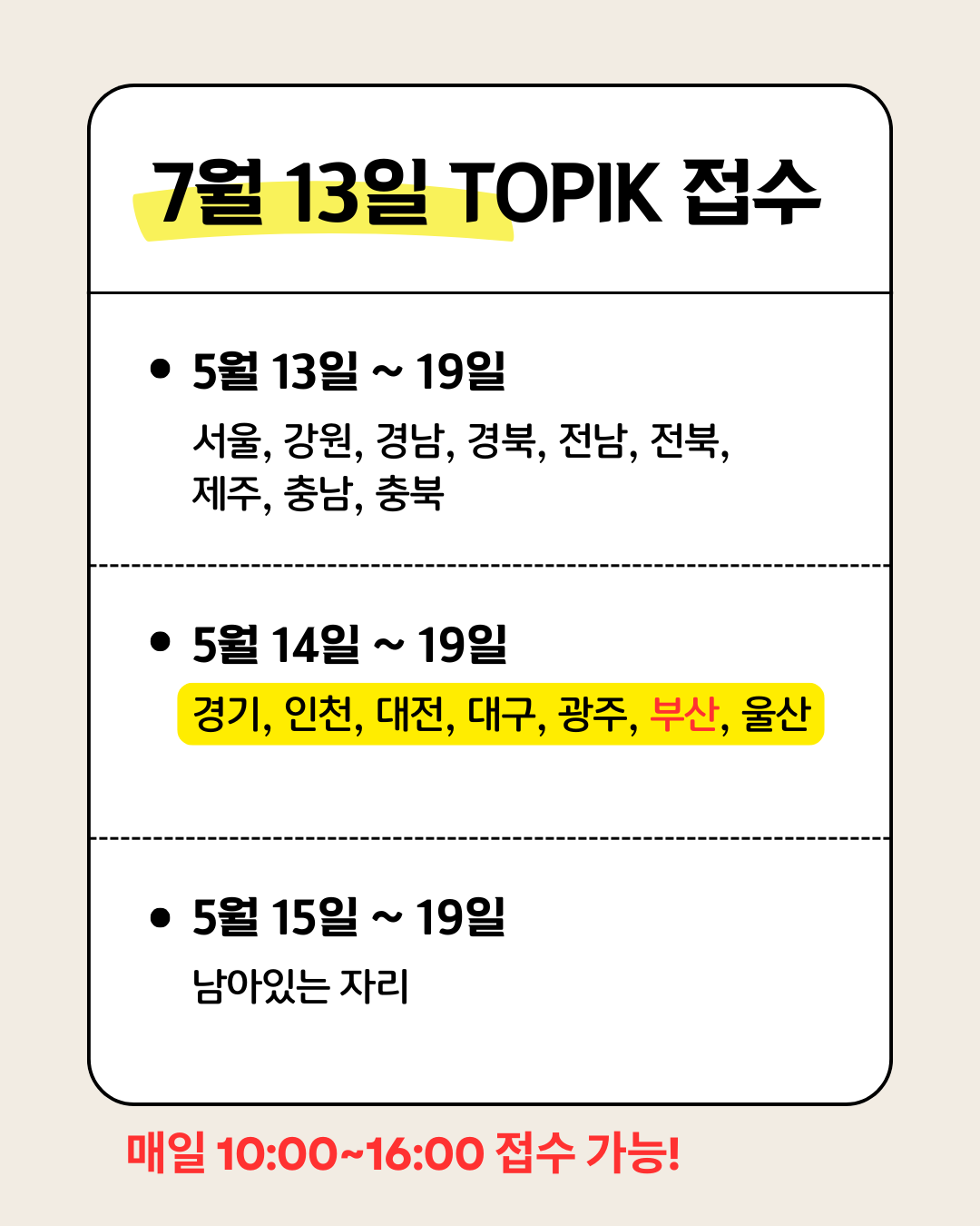 For those taking the test in Busan, registration starts on May 14th at 10 AM.