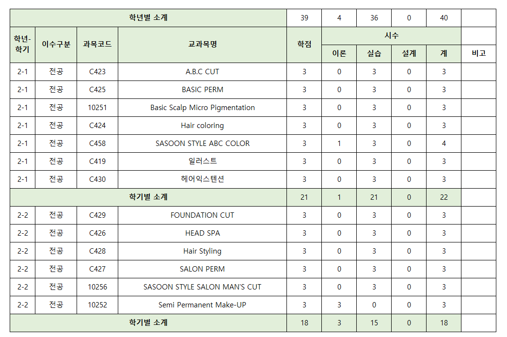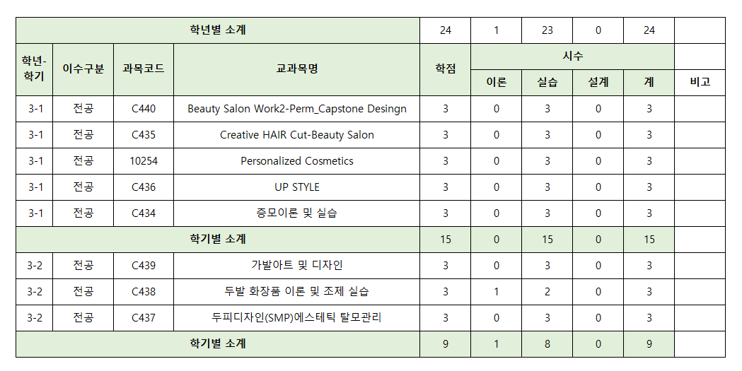 2025학년도 뷰티예술대학 헤어디자인학과 교육과정표