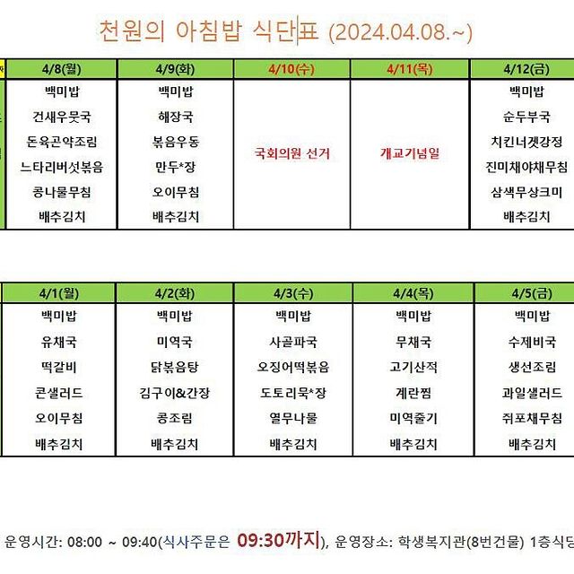 2024년 천원의 아침밥 식단표 안내