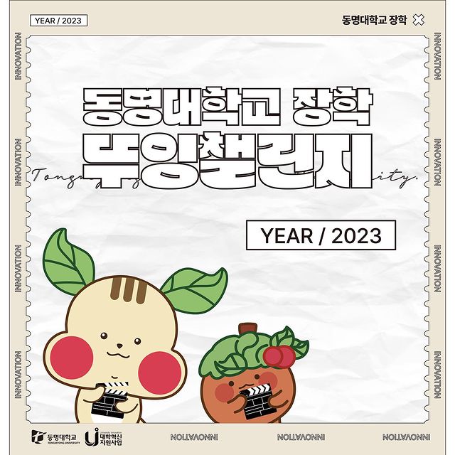 우리대학 대학혁신지원사업을 홍보해줄 TU-이노베이터 5기생을 모집합니다! 1차서류마감일: 2024.3.15.(금) ~ 3.22.(금) 17:00 마감 2차 면접: 2024.03.26.(화) 308호 대기, 307호 면접 (추후 면접 시간 알림은 개인연락으로 공지_면접 진행 수업인증서 필요시 우선알림요망) 합격공지: 2024.03.28.(목) * 서류마감은 2024.3.22(금) 오후 5:00까지 입니다. * 면접 시간 및 장소는 관련 안내 페이지를 참고해주세요. * 장학금은 한달 40시간측정 (400,000원)으로 지급됩니다. 해당 장학금을 받고 있는 학생은 지원불가합니다. (중복 교내서포터즈및 홍보단, 교내근로 지원불가) 지원서 작성 후 이메일 제출 [TU-이노베이터 5기 모집공고] 참조 제출시 파일명은 “TU-이노베이터 5기 지원_본인이름 학번”으로 저장 (제출파일명이 지켜지지 않을시 심사에서 누락될 수 있습니다) 지원서는 hwp(한글) 양식이며, 그 외 추가적인 파일(포트폴리오 등)은 PDF 로 대체 바랍니다. 제출 1. 이메일 : sungkyou@tu.ac.kr 2. 직접제출 : 동명대학교 대학본부경영관(1호관) 209호 재정혁신팀 이노베이터 담당자 (중 택 1) 대학혁신지원사업 총괄책임자