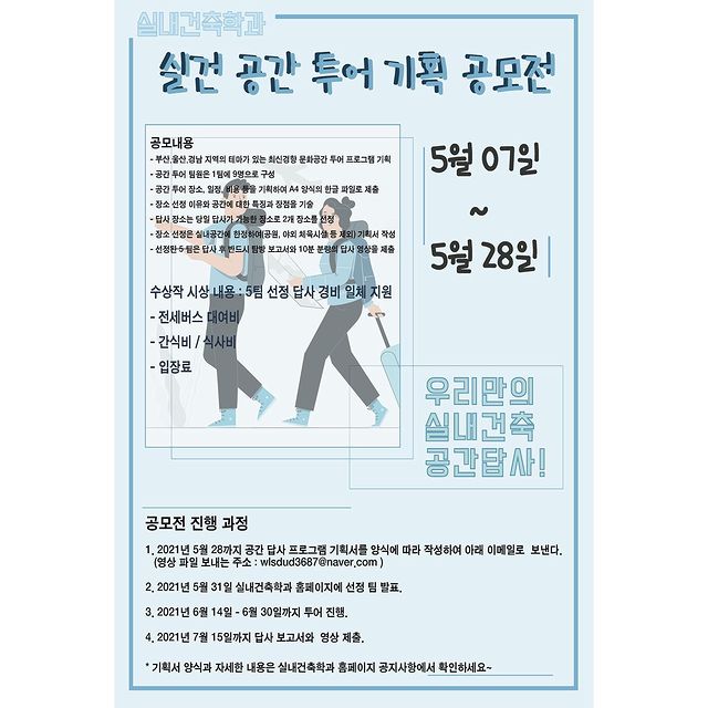 💙실건공간투어기획공모전- 5월 28일까지 공간답사프로그램 기획서를 제출하며 1팀당 9명으로 구성하며 5팀을 수상할 예정입니다 수상한 5팀은 선정된