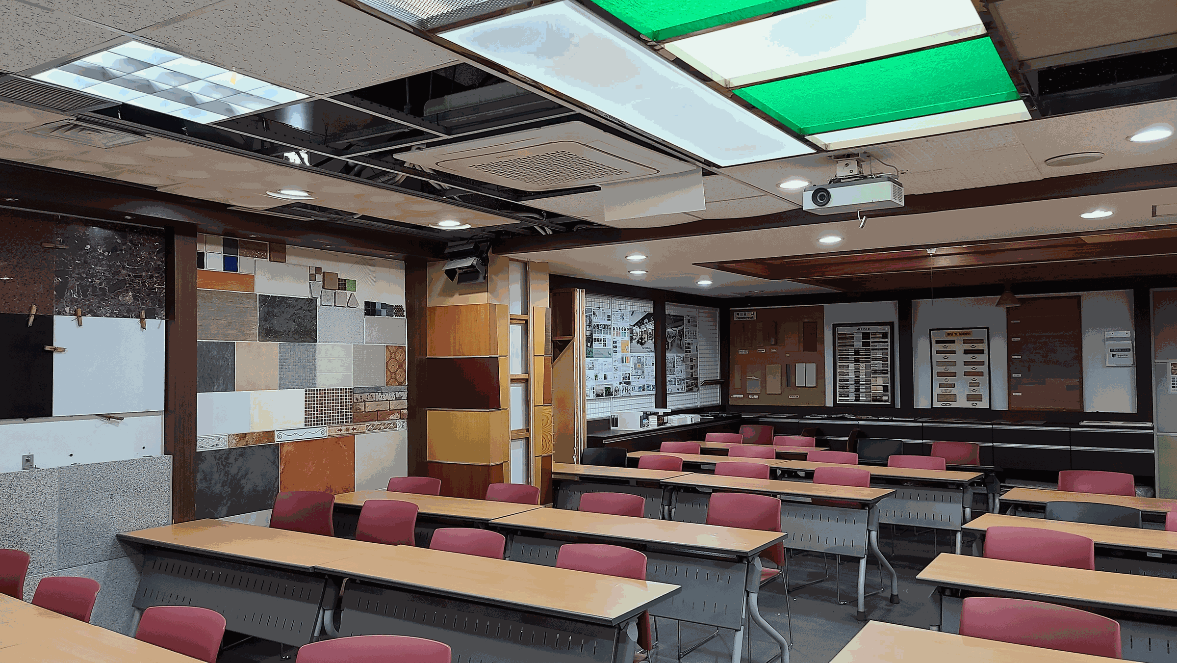 실내건축 시공현장에서 사용되는 마감재료와 공사 기법들을 보여주어 실무에 대한 이해력을 높이기 위해 실내건축 작업에 쓰이는 마감재료의 종류와 시공방법에 대한 사례를 전시하고 인터넷을 통해 수업이 진행되는 강의실.