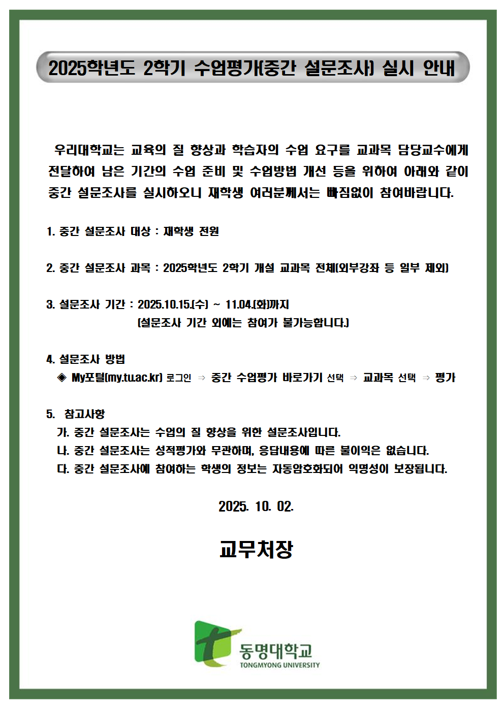 2025학년도 2학기 수업평가(중간 설문조사) 참여 안내