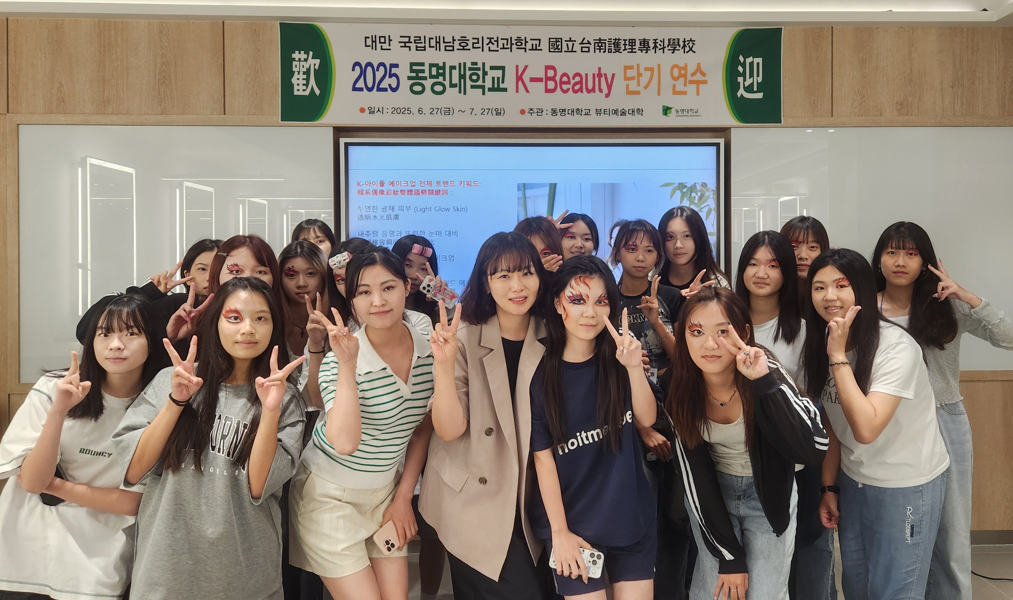 동명대학교 메이크업디자인학과는 최근 대만의 뷰티 전공 대학생을 대상으로 4일간의 메이크업 특강 프로그램을 성공적으로 마무리하였습니다. 이번 프로그램은 K-뷰티 실무 교육과 동양 문화에 대한 창의적 접근을 융합한 글로벌 뷰티 교육 콘텐츠로 높은 호응을 얻었습니다.