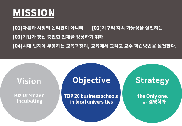 tu-경영학과의 미션은 자본과 시장의 논리만이 아니라 지구적 지속가능성을 실천하는 기업가 정신 충만한 인재를 양성하기 위해 시대 변화에 부응하는 교육과정과 교육매체 그리고 교수학습방법을 실천하는데 있다
