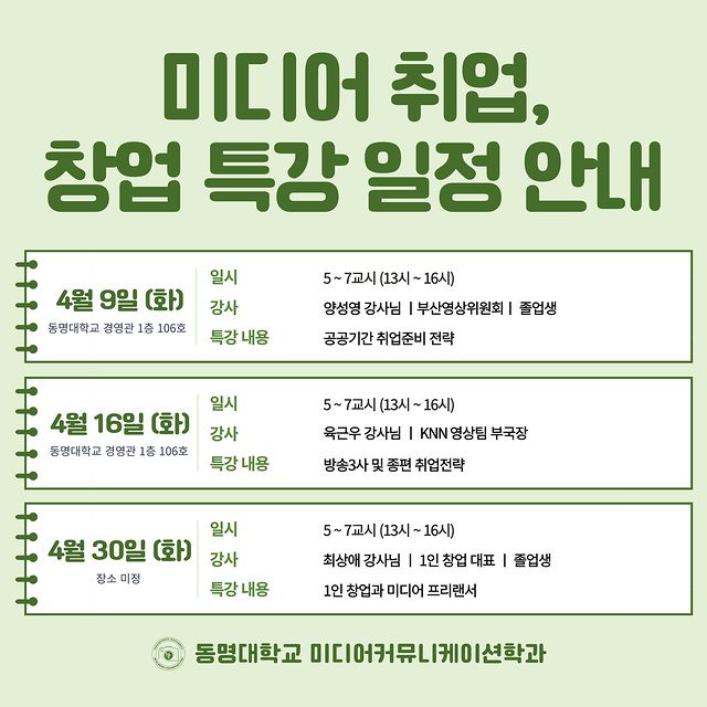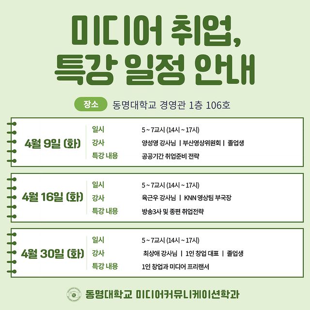 지난 4월9일, 16일, 30일 총 3일간 미디어 취업, 창업특강을 진행하였습니다.