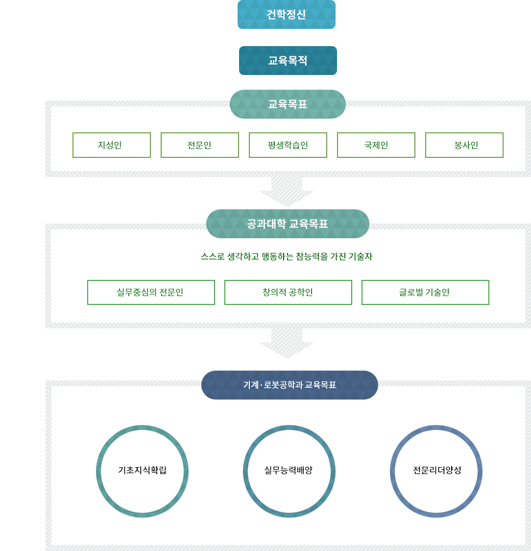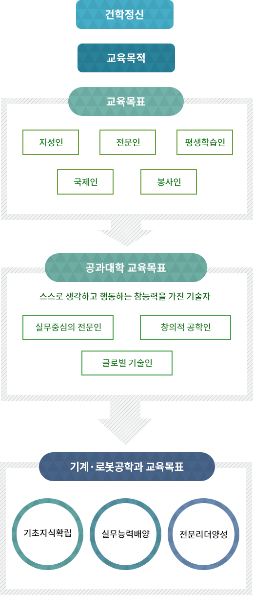 최신 산업계 관점의 기계분야 평가결과를 반영한 기계공학 교육프로그램의 운영을 통하여, 공학의 기초학문과 기계전공의 실용학문을 바탕으로 능동적으로 공학문제를 해결하는 실무 전문 기계공학인 및 기계분야에 IT기술을 융합하여 급변하는 현대 산업사회에 주도적으로 적응할 수 있는 능력을 갖춘 창의적인 기계공학인을 양성