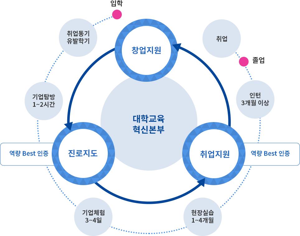 - 진로 / 취업상담 및 위·창업 정규 / 비교과 프로그램을 통한 현장체험형 전문인력 양성