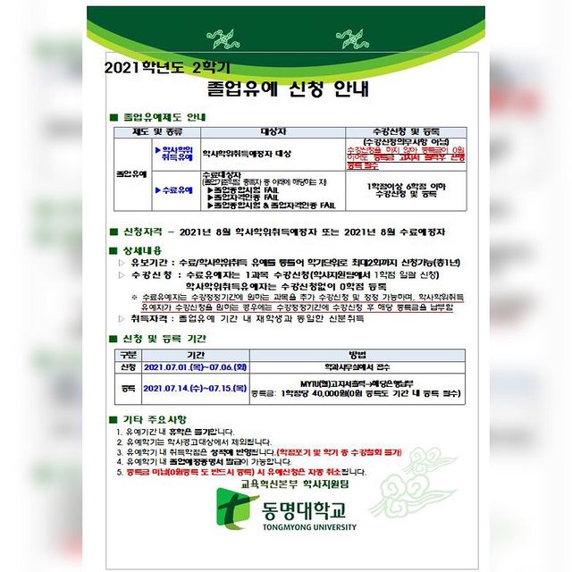 졸업유예 관심있는 학생은 학과사무실로 신청기간내(7/1~6) 연락바랍니다.