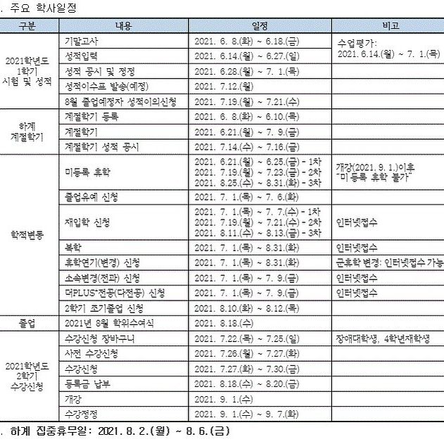 2021년 하계방학간 학사 일정에 대해 알려드리겠습니다.