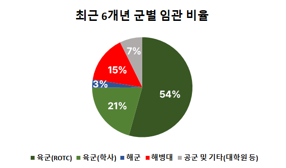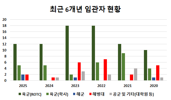 연도별(2020, 2021, 2022, 2023, 2024, 2025년) 취업현황 - 육군(ROTC), 육군(학사), 해군, 해병대, 공군 및 기타(대학원 등), 계로 구성