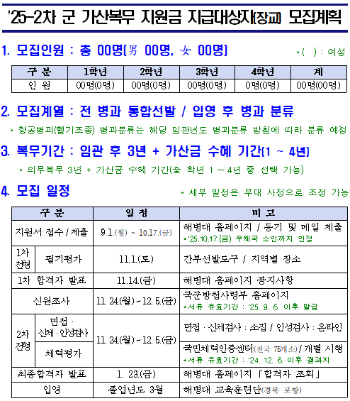'25-2차 해병대 군 가산복무 지급대상자(장교) 모집 계획입니다. 자세한 내용은 첨부파일을 확인 바랍니다.