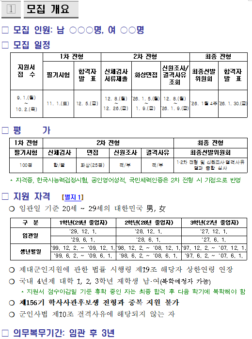 제156기 학사사관후보생 및 25년 2차 예비장교후보생 모집안내입니다. 자세한 내용은 첨부파일 확인 바랍니다.