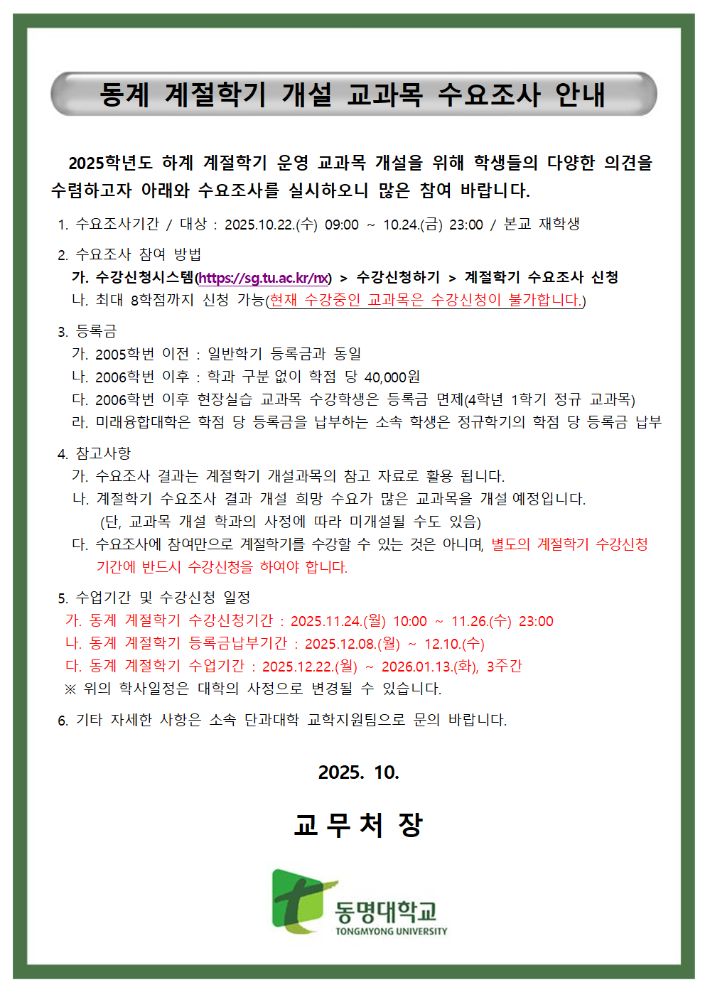 2025학년도 동계 계절학기 개설 교과목 수요조사 실시 안내